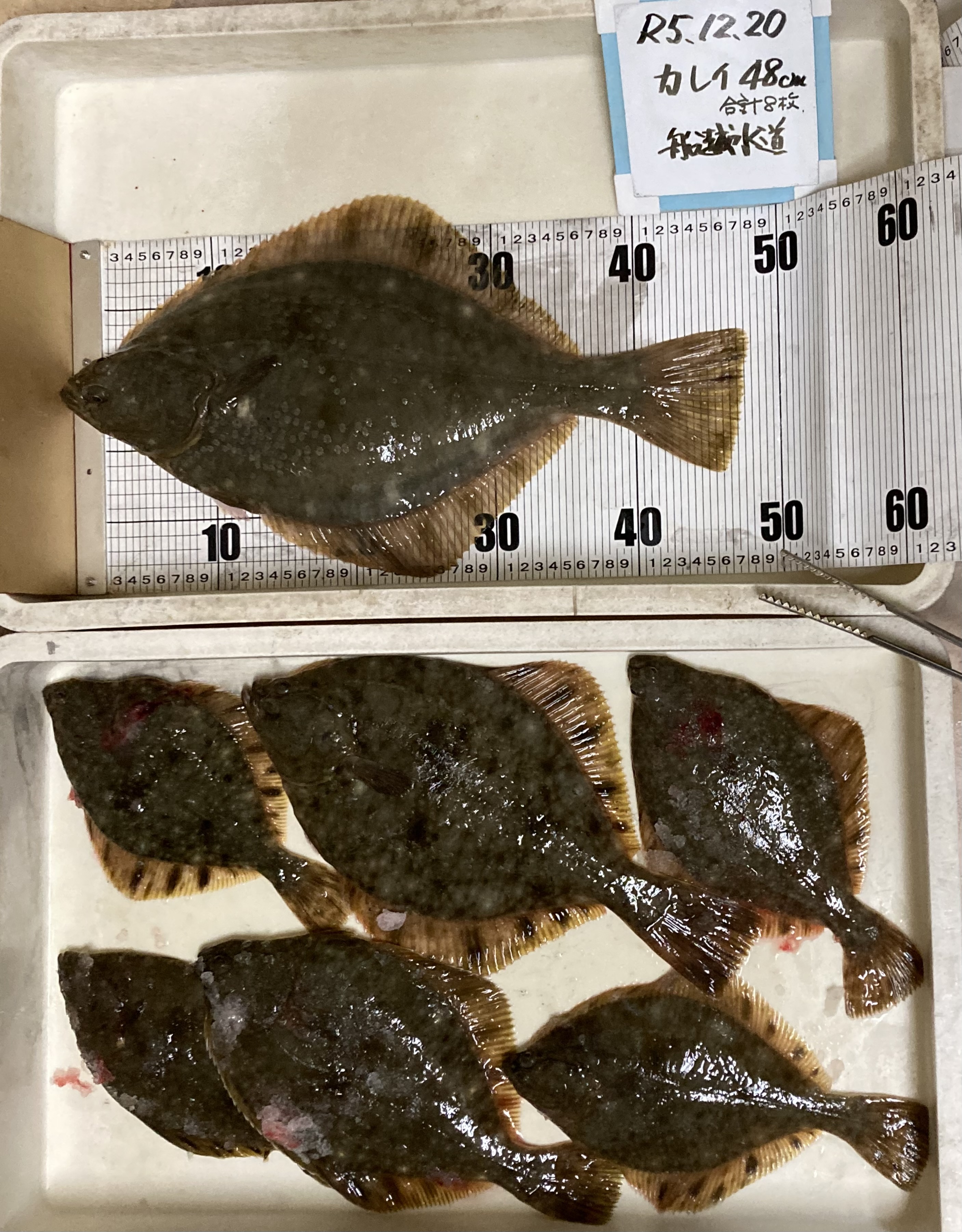 船越水道カレイ釣果☆ 2023年12月22日2023年12月22日 myblog こんにちは☆戸田釣具店です。 大満足な投げカレイ釣果情報の紹介です。 12月20日船越水道で大物48cm筆頭に8枚のカレイを釣り上げてきました。(1枚途中下車) どのカレイもハイブリットでした。 加藤さん、情報提供と撮影協力ありがとうございました。