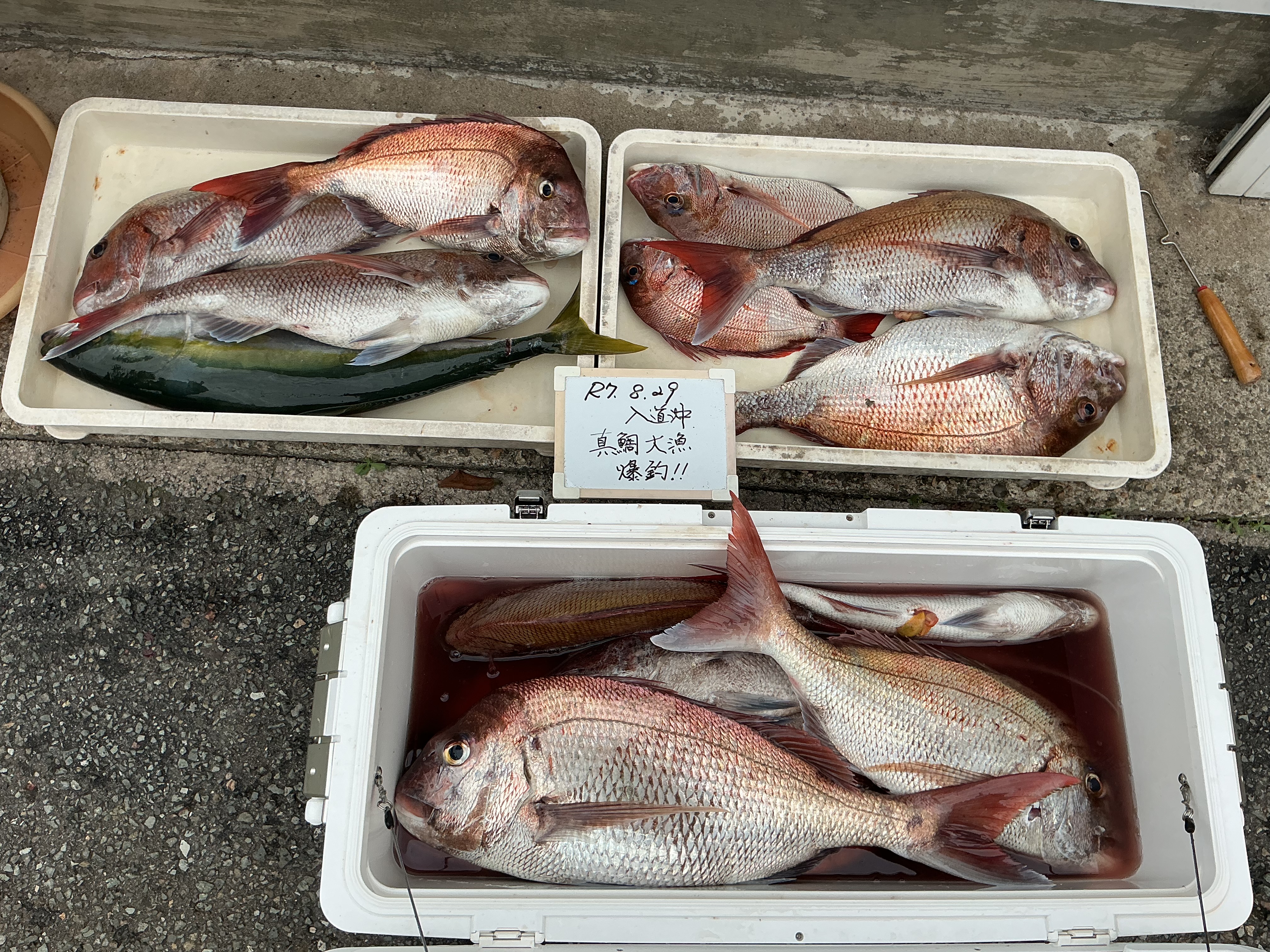 【釣果情報】8/29入道沖 爆釣!大漁真鯛(^^♪ 2025年8月29日2025年9月1日 myblog 【今日の釣果】 ~入道沖 大爆釣釣果~ 噂の大漁真鯛釣果を目の当たりにさせていただきました~ 60クラスが十数枚とそれ以下のサイズあわせて約20枚!! ”何にでも釣れる”という入れ食い状態で 「タイラバよりジグのほうがでっけの来たな!」と釣り人の川原さん♬ 釣れすぎてクーラーボックスに入りきらずやむなく納竿という、うれしい悲鳴も☆彡 〈北浦 斉藤釣具店和丸さん乗船〉 川原さん、ありがとうございました~m(__)m